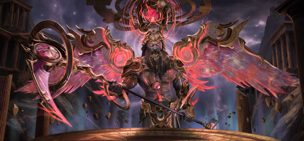In the Pantheon building (aka Clan or Guild) you can challenge the Pantheon Boss. This boss is intended to be attacked by the entire Pantheon. The first one released is the ginormous Chronos. It looks from the images released by FATELESS that the boss will be on an affinity cycle. Each version of the boss looks likely different as it is colored by the affinity it currently has (Strength red, Cunning green, Wisdom blue, Eternal purple).