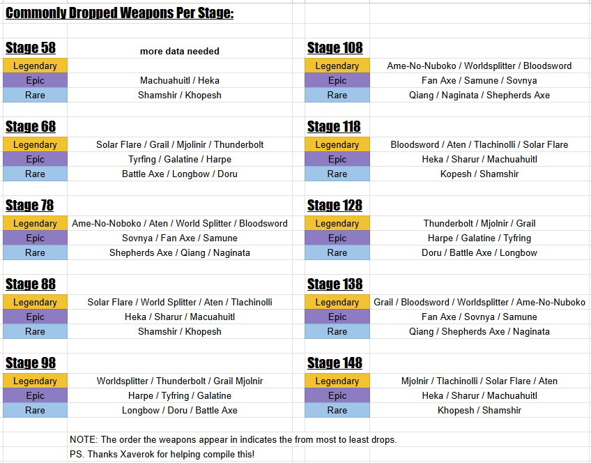 One of the results is this table, which tells you which stage drops which weapons.